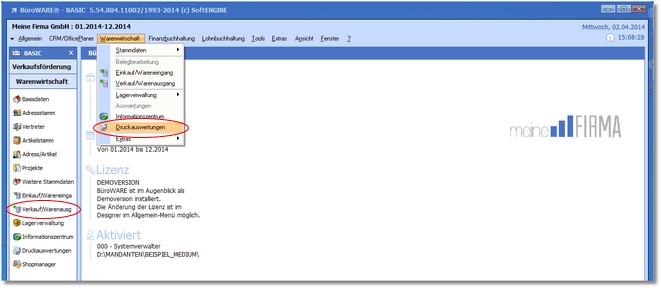 1. Klicken Sie mit der Maus im Hauptmenü auf "Warenwirtschaft > Auswertungen > Druckauswertungen".