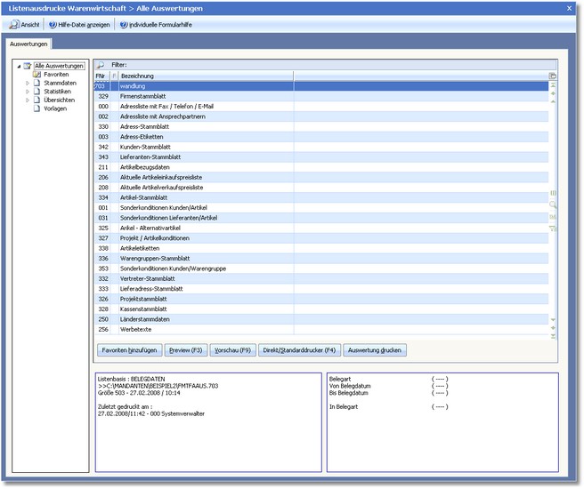 Dieser Programmpunkt stellt Ihnen in einem zentralen Dialog alle im Programm verfügbaren Listauswertungen zur Verfügung.