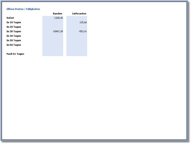 Der Bereich "Fälligkeiten" stellt das Ergebnis der Fälligkeitsanalyse dar. Hier ersehen Sie nach Tagen gestaffelt, welche Zahlungseingänge zu erwarten sind.