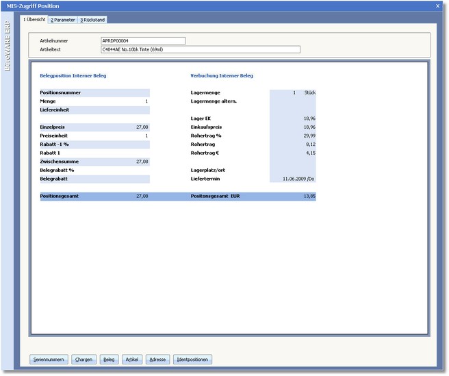 Dieser Button verzweigt in das MIS-Artikel der Position.