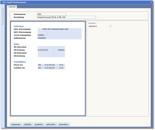 Dieses MIS-System stellt standardmäßig eine Informationsmaske bereit. Hier ersehen Sie im Wesentlichen die Stamminformationen der gewählten Seriennummer.