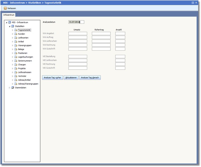 << Hier KLicken um eine Inhaltsübersicht anzuzeigen >> Navigation: Warenwirtschaft > Auswertungen > Informationszentrum > MIS-Infozentrum > Tagesstatistik |