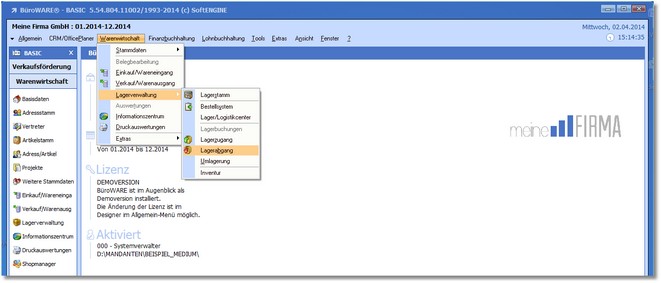 1. Zeigen Sie mit der Maus im Hauptmenü auf "Warenwirtschaft > Lagerverwaltung > Lagerabgang".