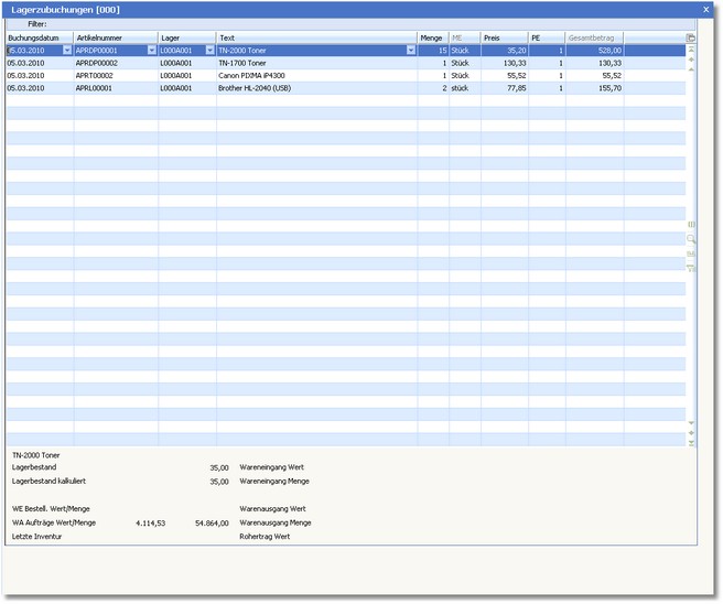 Hier können Sie Lagerzugänge buchen. Dieser Vorgang gleicht der Positionserfassung im Wareneingang/Warenausgang.