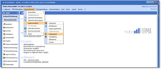 1. Zeigen Sie mit der Maus im Hauptmenü auf "Warenwirtschaft > Lagerverwaltung > Lagerzugang".