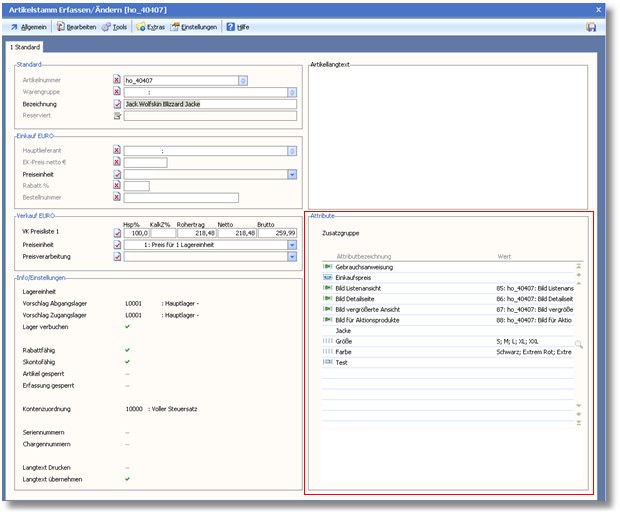 Innerhalb eines Artikels wird eine neue Maske mit Attributen angezeigt.