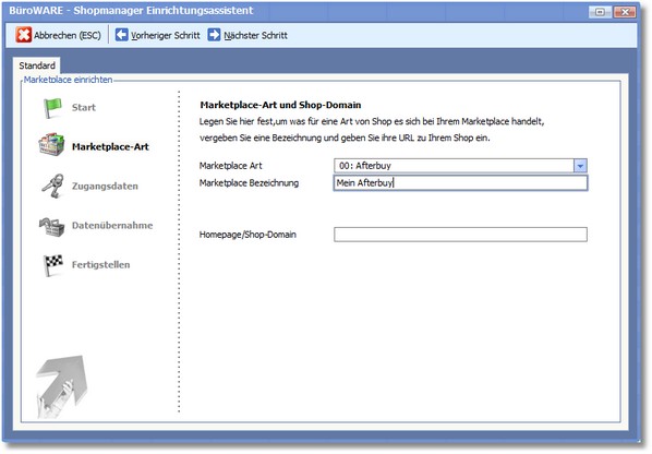 3. Klicken Sie auf <Nächster Schritt> und füllen Sie in der Dialogmaske "Marketplace-Art" des Einrichtungsassistenten folgende Felder: