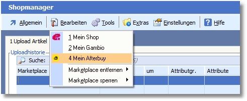<< Hier KLicken um eine Inhaltsübersicht anzuzeigen >> Navigation: Warenwirtschaft > Extras > Shopmanager > Marketplaces > Afterbuy > Marketplace verwalten |