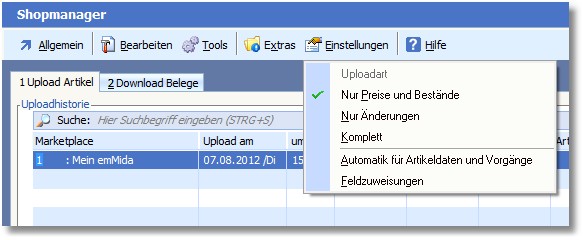Über den Menüpunkt "Einstellungen" im Shopmanager kann konfiguriert werden, wie und welche Artikeldaten zum Marketplace übertragen werden sollen.