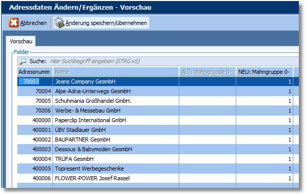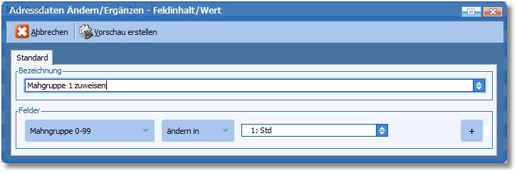 Wir wollen den zuvor selektierten Adressen – ohne Mahngruppe - nun die Mahngruppe 1 zuweisen.