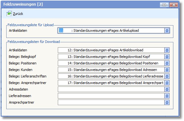 In den Feldzuweisungslisten ist definiert, welches Feld im Programm in welches Feld im Shop übertragen wird. Für jeden Bereich (Artikelupload, Artikeldownload) gibt es eine Feldzuweisungliste.