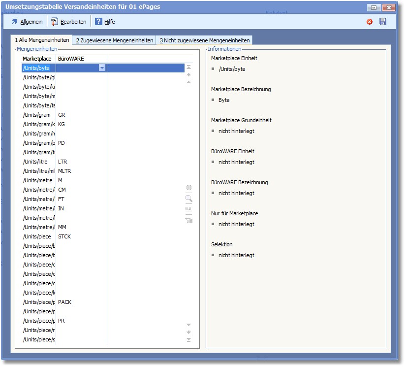 << Hier KLicken um eine Inhaltsübersicht anzuzeigen >> Navigation: Warenwirtschaft > Extras > Shopmanager > Marketplaces > ePages > Marketplace verwalten > Umsetzungstabellen > Mengeneinheiten |