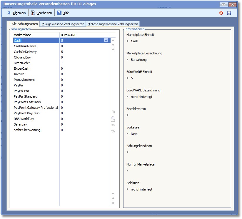 << Hier KLicken um eine Inhaltsübersicht anzuzeigen >> Navigation: Warenwirtschaft > Extras > Shopmanager > Marketplaces > ePages > Marketplace verwalten > Umsetzungstabellen > Zahlarten |