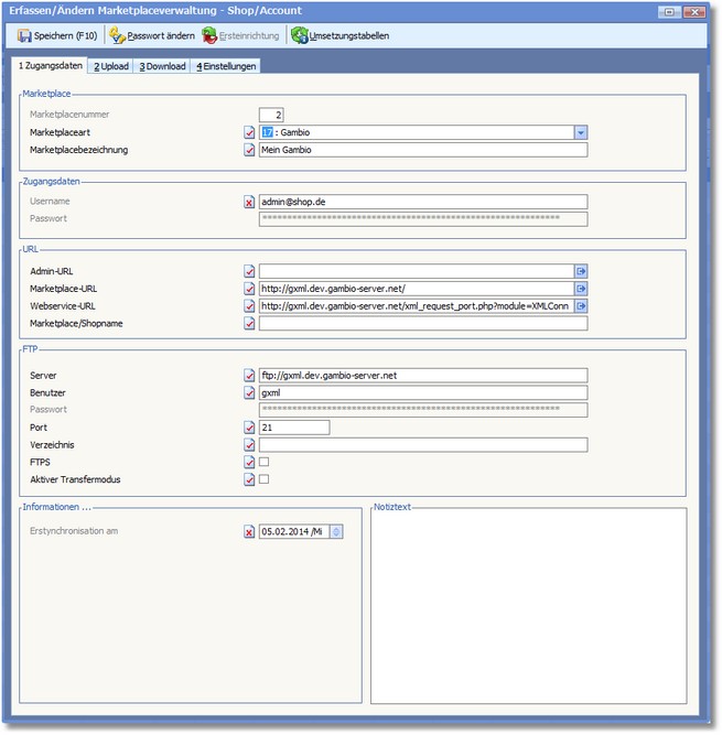 In der Marketplaceverwaltung können Sie die Zugangsdaten zum Marketplace verwalten, Einstellungen zu Upload und Download einsehen und bei Bedarf ändern.