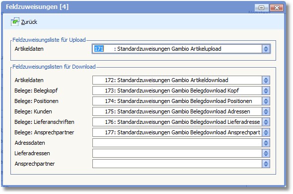 In den Feldzuweisungslisten ist definiert, welches Feld im Programm in welches Feld im Shop übertragen wird. Für jeden Bereich (Artikelupload, Artikeldownload) gibt es eine Feldzuweisungliste.