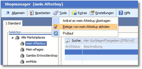 1. Markieren Sie in der Baumselektion den gewünschten Marketplace und klicken Sie auf den Menüeintrag "Tools > Belege von (Name Marketplace) abholen".