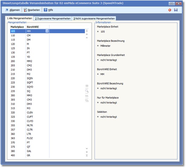 << Hier KLicken um eine Inhaltsübersicht anzuzeigen >> Navigation: Warenwirtschaft > Extras > Shopmanager > Marketplaces > emMida > Marketplace verwalten > Umsetzungstabellen > Mengeneinheiten |
