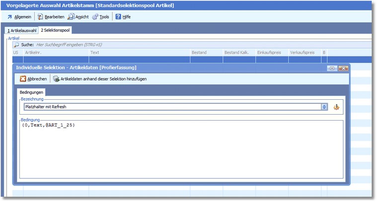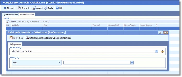 << Hier KLicken um eine Inhaltsübersicht anzuzeigen >> Navigation: Warenwirtschaft > Stammdaten > Selektionspools > Neuerungen Selektionspool > Profierfassung > Platzhalter > Platzhalter mit Refresh |