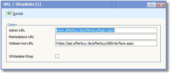 << Hier KLicken um eine Inhaltsübersicht anzuzeigen >> Navigation: Warenwirtschaft > Extras > Shopmanager > Marketplaces > Afterbuy > Marketplace verwalten > URL/Shoplinks |
