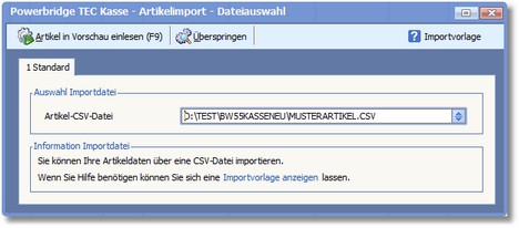 << Hier KLicken um eine Inhaltsübersicht anzuzeigen >> Navigation: BüroWARE Powerbridge > TEC-Kassenschnittstelle > BüroWARE-Schnittstelle einrichten > Artikel importieren |