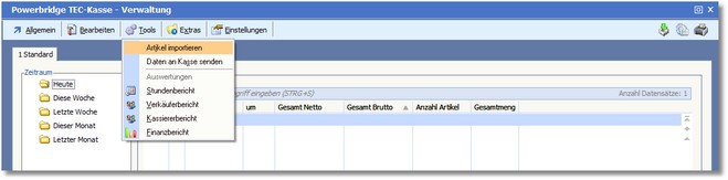 1. Klicken Sie mit der Maus in der Verwaltung TEC Kasse auf den Button <Tools> und wählen Sie im Dropdownmenü den Menüpunkt "Artikel importieren".