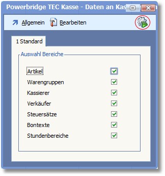 << Hier KLicken um eine Inhaltsübersicht anzuzeigen >> Navigation: BüroWARE Powerbridge > TEC-Kassenschnittstelle > BüroWARE-Schnittstelle einrichten > Daten an Kasse senden |