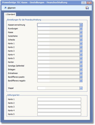 << Hier KLicken um eine Inhaltsübersicht anzuzeigen >> Navigation: BüroWARE Powerbridge > TEC-Kassenschnittstelle > Verwaltung TEC Kasse > Fibu-Einstellungen |