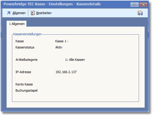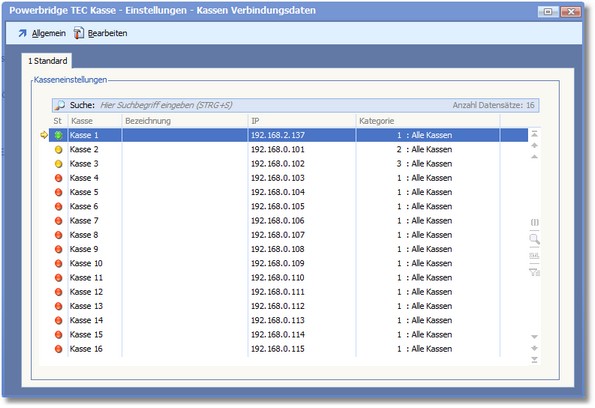 << Hier KLicken um eine Inhaltsübersicht anzuzeigen >> Navigation: BüroWARE Powerbridge > TEC-Kassenschnittstelle > Verwaltung TEC Kasse > Kassen |