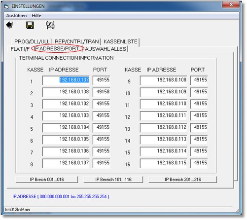 5. In der Karteikarte "IP ADRESSE/PORT" tragen Sie die IP-Adresse ein, die Sie zuvor in der Kasse festgelegt haben.