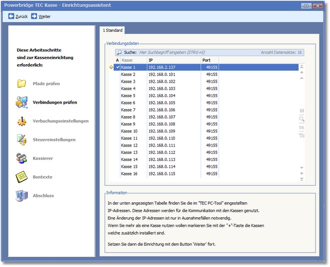 << Hier KLicken um eine Inhaltsübersicht anzuzeigen >> Navigation: BüroWARE Powerbridge > TEC-Kassenschnittstelle > BüroWARE-Schnittstelle einrichten > Verbindungen prüfen |