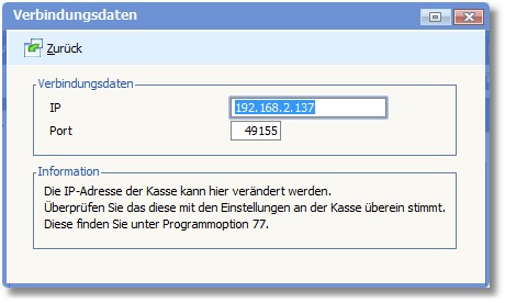 In der Maske der Verbindungsdaten wird die in der Kasse eingestellte IP-ADERSSE und der dazugehörige PORT eingetragen.