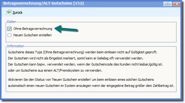 Eine zusätzliche Option ist es, einen Gutschein anzulegen, der im Falle eines Restwertes einen neuen Gutschein ausstellt.