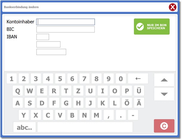 2. Tragen Sie hier KONTOINHABER, BIC und IBAN ein und klicken Sie anschließend auf <Nur im BON speichern>.