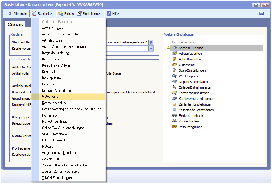 << Hier KLicken um eine Inhaltsübersicht anzuzeigen >> Navigation: Kassensystem > Technische Informationen (Systeminformation) > Vorbereitende Arbeiten > Grundeinrichtung der Kasse > Detaileinrichtung der Kasse (Basisdaten) |