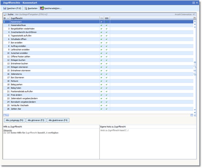 Die Benutzerrechte zu Kassenvorgängen werden einfach per Häkchen vergeben. Klicken Sie dazu auf <Alle aktivieren> bzw. <Alle deaktivieren>.