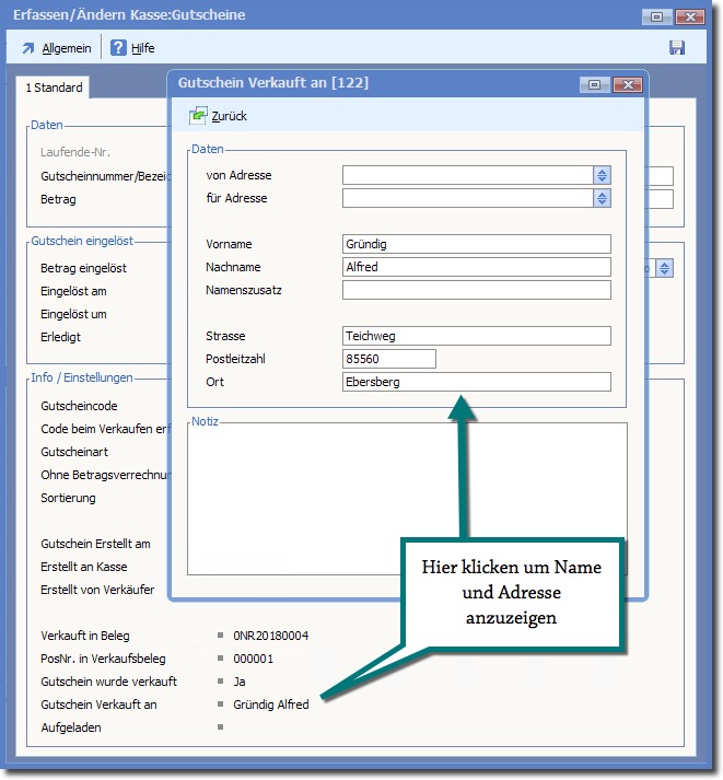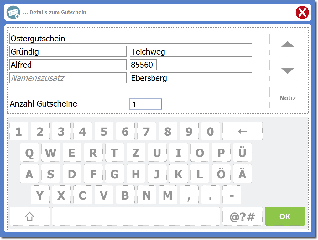 << Hier KLicken um eine Inhaltsübersicht anzuzeigen >> Navigation: Kassensystem > Bedienung der Kasse (Anwenderinformationen) > Spezielle Vorgänge an der Kasse > Gutscheine > Einen Gutschein mit Adresse und/oder spezieller Bezeichnung verkaufen |