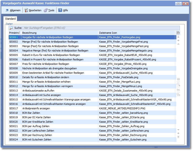 Über den Bereich "Einstellungen" in den Basisdaten der Kasse gibt es den Eintrag "Finderdatenbank". Hier handelt es sich um die Datenbank für das Kassieren-Tool "Finder".