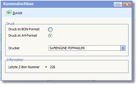Stellen Sie hier ein in welchem Format und auf welchem Drucker der Z-BON Ausdruck beim Kassenabschluss erfolgen soll.