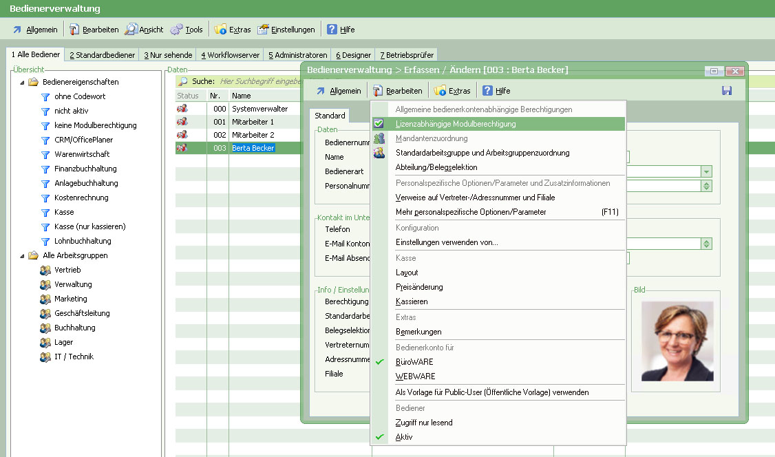 Wählen Sie einen Bediener aus und rufen Sie die Funktion "Bedienerbezogene Modulberechtigung" im Menü "Bearbeiten" auf.