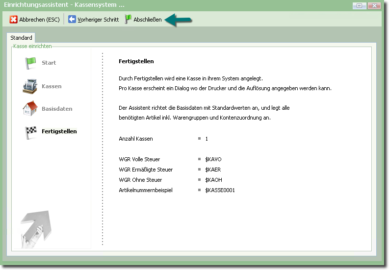 Dieser Assistent führt Sie durch die Kasseneinrichtung und legt ggf. "im Hintergrund" nötige Daten an.