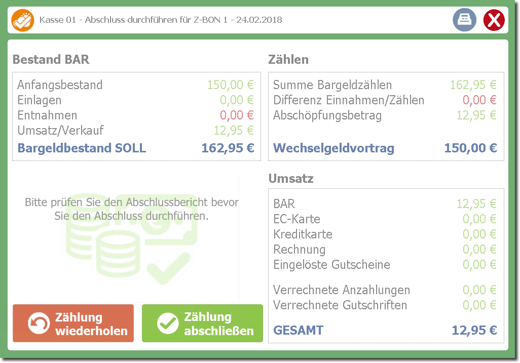 Der Abschluss wird durchgeführt und der "Z-BON" gedruckt.