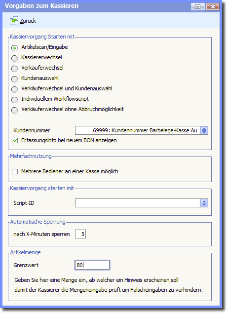 Geben Sie hier eine Menge ein, ab welcher ein Hinweis erscheinen soll, damit der Kassierer die Mengeneingabe prüft um Falscheingaben zu verhindern.